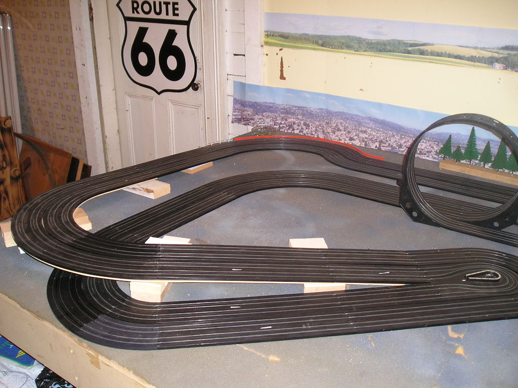 heres some pics i found of my layout in its begining stage, i had laid out my track design and was ready for landscaping to begin, track base is "L" shaped and is 2 laned as i wanted to get the most out of it as it could, track i have used is Aurora track from the 1960s, pre AFX, 3 pics- L/H - Centre - RH