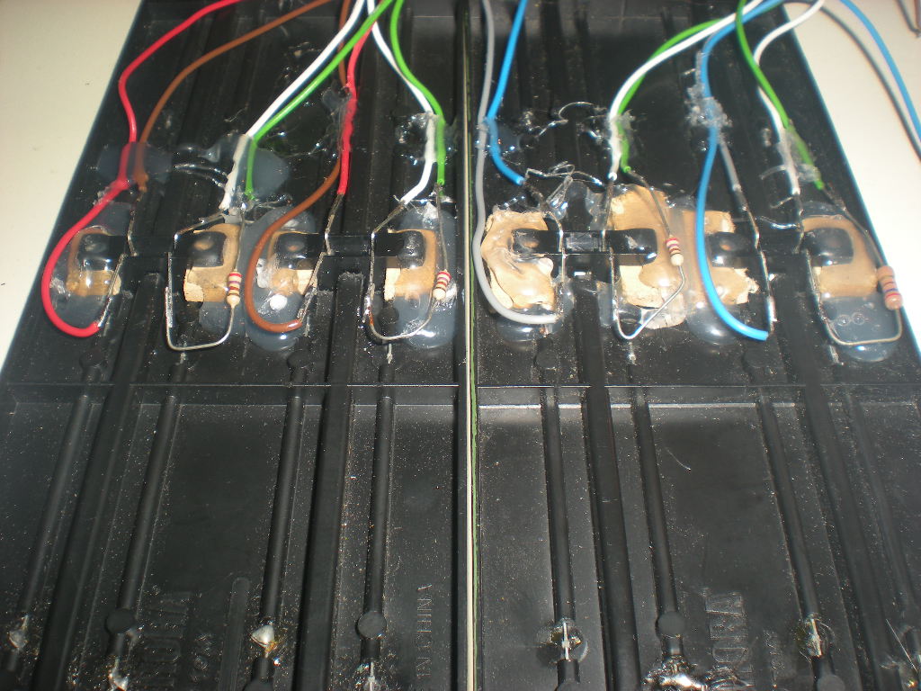 Second attempt used the more conventional track mounted 5mm foto transistors & 5mm LED's above. 20,000 candle power, expensive but they work 100%.